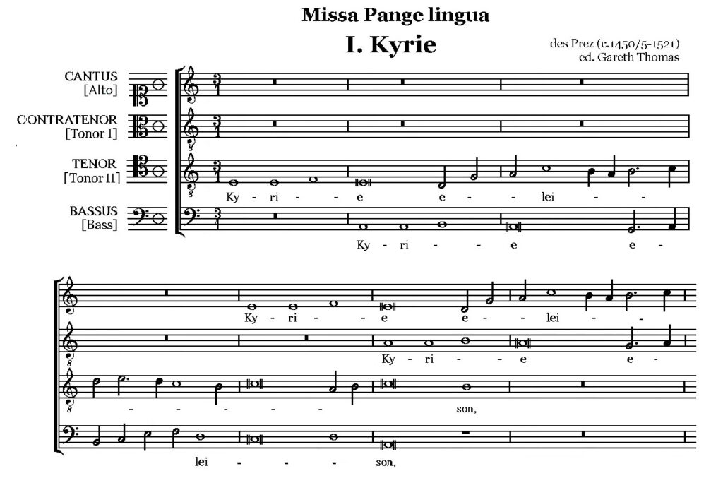 ミサ『パンジェ・リングワ』冒頭の「キリエ」はミ・ミ・ファ.・ミと歌い出される。そこに「キーリィエー」と歌詞が付く。荘重なフリギア風のメロディーである。