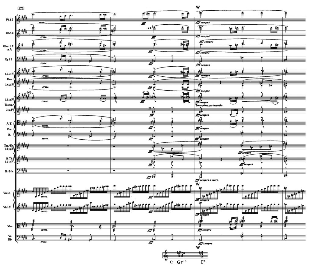 そしてその頂点でハ長調が爆発し、まばゆい光が氾濫する。まさにドイツの6の和音がホ長調からの3度転調を惹き起こした瞬間だった(記号W )。