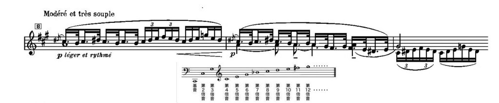 だが第9小節では下降するラインで、Gはシャープしたままでである。だからこういうべきなのかもしれない。自然倍音の味付けが施されたリディア旋法のようだ、と。