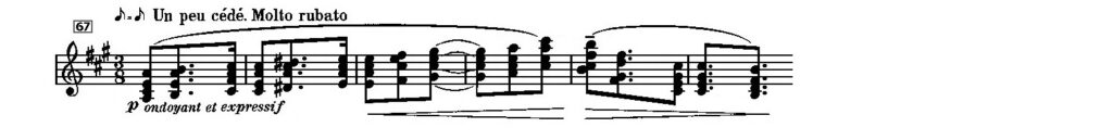 そして次の部分でリディア旋法となり、後半は長音階(イオニア旋法)ぽくもある。un peu cédé 「いくぶん譲って」という変わった指示があるが、テンポを変えるのではなく(♪=♪の指示がある)、少し厳格さを緩めて、開放的にといった意味か。自由に高揚して、といった感じだろうか。「モルト・ルバート」が補足しているように。
