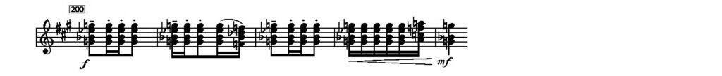 mfに始まり、f、piuf、そしてffへの上昇、さらに最後の2小節は三拍子から二拍子へ前のめり的に急迫し「その時」はやって来る。この間、ハーモニー構造は変わらない。使われている音を調号なしで書き出すと、譜例下左のようになる。さらに最後の和音をエンハーモニックで書き換えると(♭ミ=♯レ)、真ん中の和音となる。