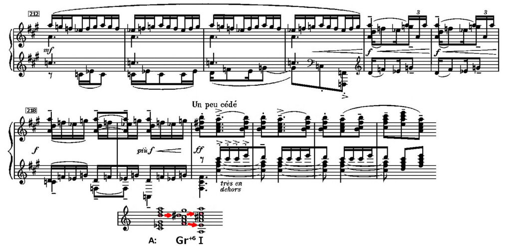 この和音の核心を成すのはFと♯Dの特徴的な増6度である。特にこの場合、Fの5度上にCがあることから、「ドイツの6の和音」となる(ちなみに音がAだと「イタリアの6」、Bだと「フランスの6」」と呼ばれる)。一般的な表記で「Gr+6」で記しておこう。増6度を形成するD♯とFは半音上と下に開くように導音進行し、両方とも強力にドミナントEに到達する(譜例赤の矢印)。こうして楔を打ち込むようにしてドミナントを確立する最強の和音となる。