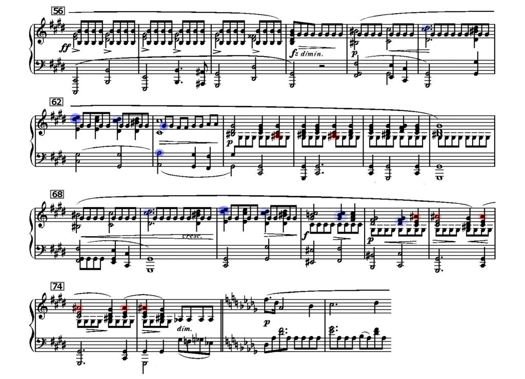 ブリッジは中間部を引き継ぐように始まるのだが、これまでになかった新しい要素が現れる。まず61小節目の頭に出る嬰ハC♯-嬰ニ D♯ の「長」2度のぶつかりである。次の小節では、嬰ニD♯-ホE の「短」2度が軋み、いっそう痛々しい響きとなる。上の譜例では青で示し、長と短は、一応、色の濃さで表してみた(短の青色が濃い)。