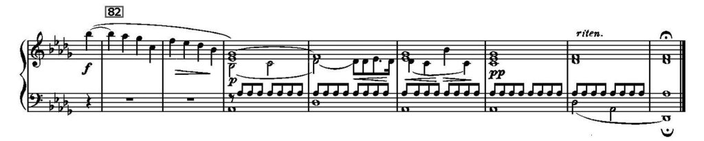 まだ完全な回復には遠かった。再びブリッジの冒頭部分が繰り返される(第68小節)。だが「癒やしの兆し」といった部分で、嬰イA♯がソプラノでいっそう明確に、しかも執拗に現れるようになる(第72-4小節)。そして遂に変二長調の冒頭部分に辿り着くのである。別のいい方をすれば、はじめてEはE♯=Fとなる。